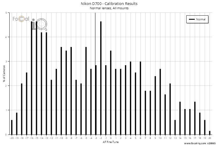 The histogram below shows the frequency of calibration results from all FoCal calibration tests run on the Nikon D700 with F mount lenses.