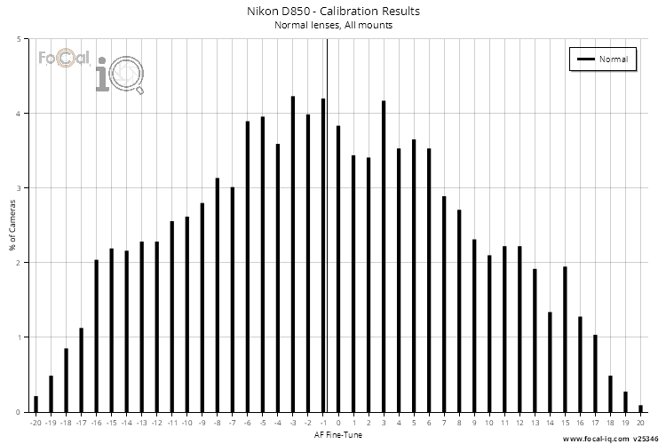 The histogram below shows the frequency of calibration results from all FoCal calibration tests run on the Nikon D850 with F mount lenses.