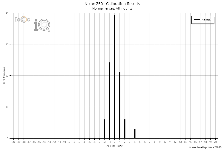 The following table shows the range of Focus Adjustment values for the best 50% of tests on this camera across all lenses. If you were to buy two Nikon Z50 cameras, it is statistically likely that one of them will require more than the adjustment shown below.
