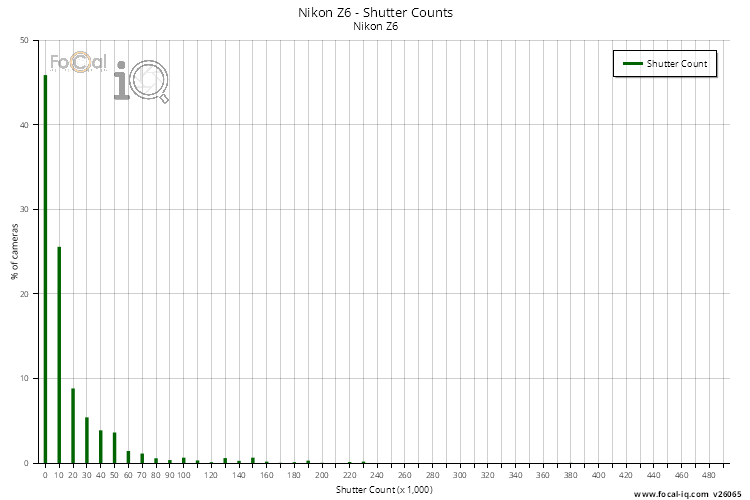 The following chart shows the distribution of shutter counts reported by cameras tested with FoCal. The horizontal axis of the chart is grouped into bins of 10,000 shutter actuations.