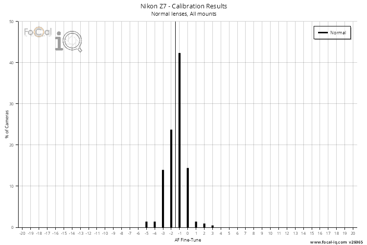 The following table shows the range of Focus Adjustment values for the best 50% of tests on this camera across all lenses. If you were to buy two Nikon Z7 cameras, it is statistically likely that one of them will require more than the adjustment shown below.