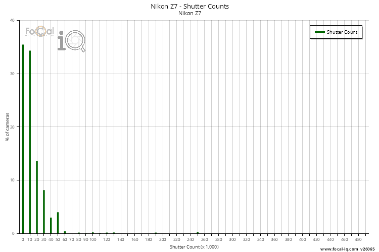 The following chart shows the distribution of shutter counts reported by cameras tested with FoCal. The horizontal axis of the chart is grouped into bins of 10,000 shutter actuations.