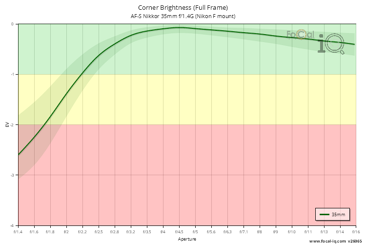 The vignetting information shows how the light is attenuated in the corners of the frame across the aperture range.