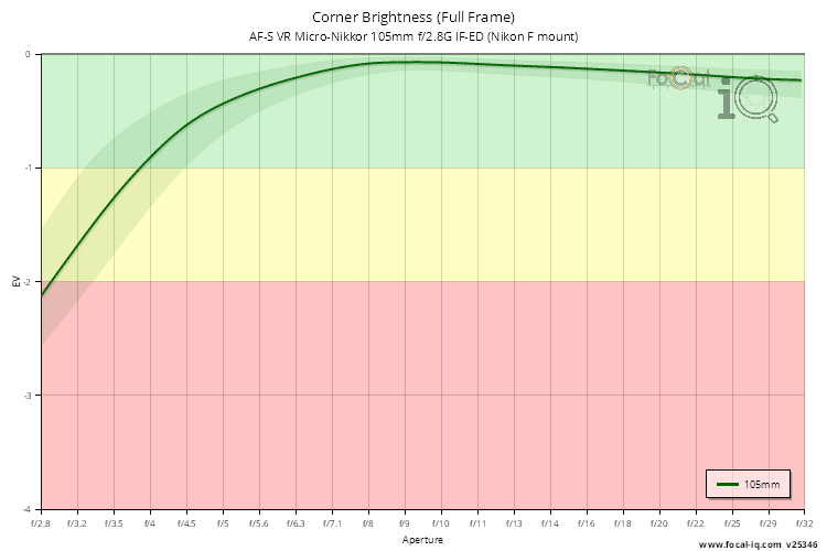 The vignetting information shows how the light is attenuated in the corners of the frame across the aperture range.