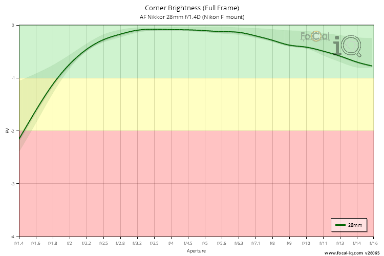 The vignetting information shows how the light is attenuated in the corners of the frame across the aperture range.