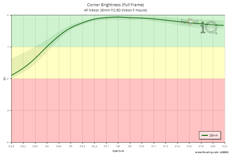 The vignetting information shows how the light is attenuated in the corners of the frame across the aperture range.