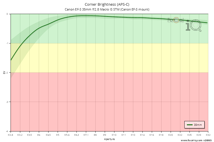 The vignetting information shows how the light is attenuated in the corners of the frame across the aperture range.