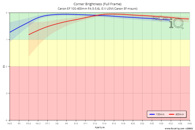The vignetting information shows how the light is attenuated in the corners of the frame across the aperture range.