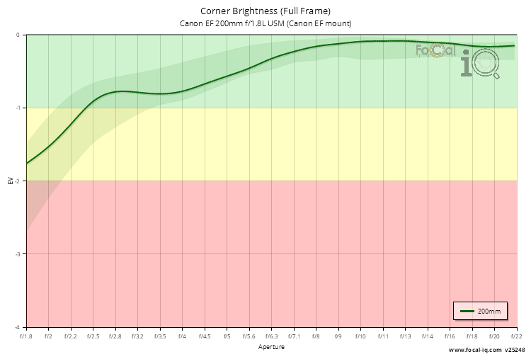 The vignetting information shows how the light is attenuated in the corners of the frame across the aperture range.