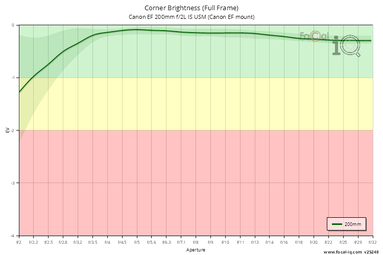 The vignetting information shows how the light is attenuated in the corners of the frame across the aperture range.