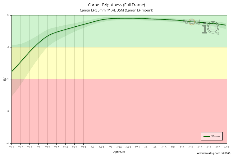 The vignetting information shows how the light is attenuated in the corners of the frame across the aperture range.