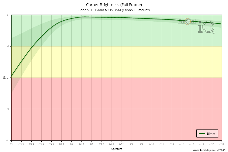 The vignetting information shows how the light is attenuated in the corners of the frame across the aperture range.