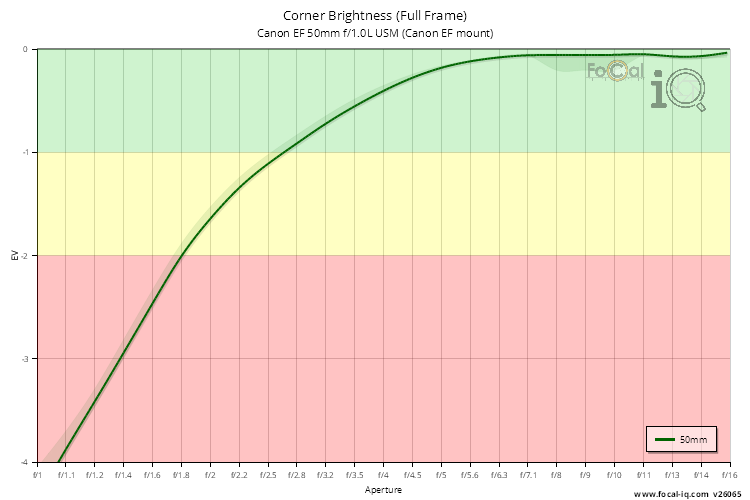 The vignetting information shows how the light is attenuated in the corners of the frame across the aperture range.