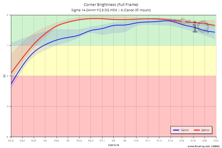 The vignetting information shows how the light is attenuated in the corners of the frame across the aperture range.