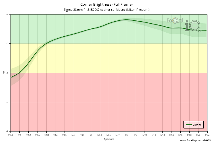 The vignetting information shows how the light is attenuated in the corners of the frame across the aperture range.