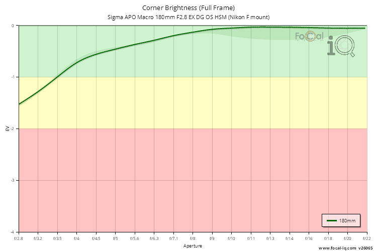 The vignetting information shows how the light is attenuated in the corners of the frame across the aperture range.