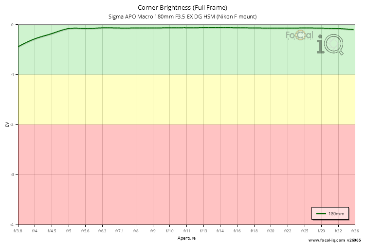 The vignetting information shows how the light is attenuated in the corners of the frame across the aperture range.