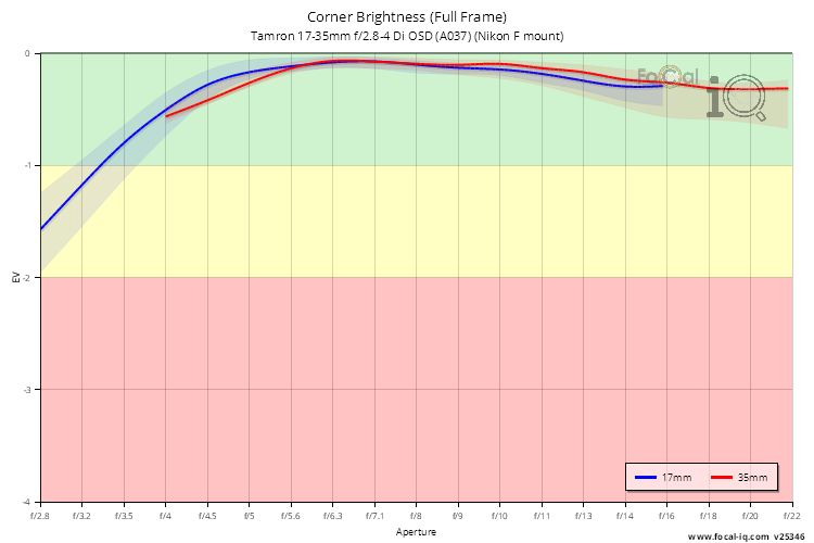 The vignetting information shows how the light is attenuated in the corners of the frame across the aperture range.