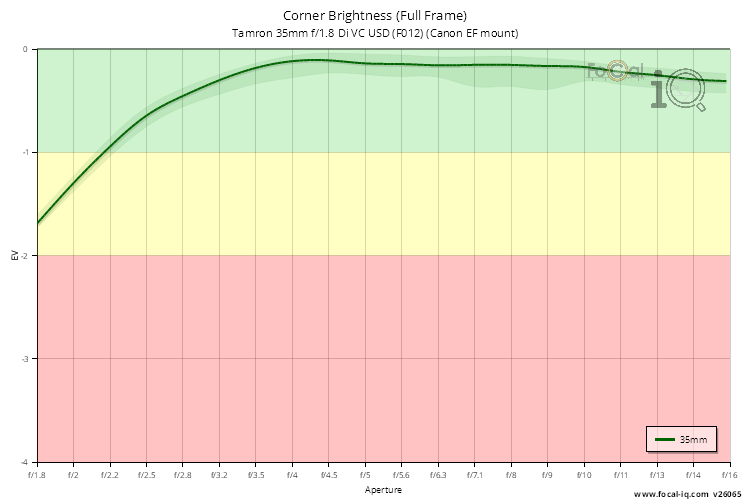 The vignetting information shows how the light is attenuated in the corners of the frame across the aperture range.
