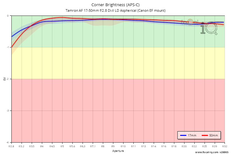 The vignetting information shows how the light is attenuated in the corners of the frame across the aperture range.