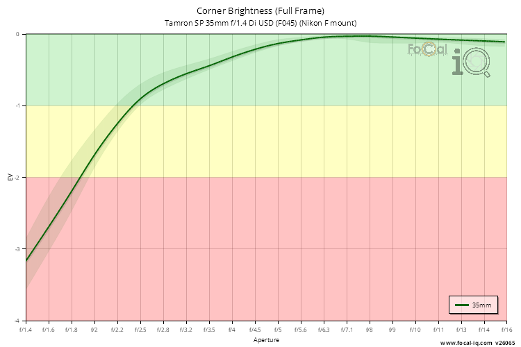 The vignetting information shows how the light is attenuated in the corners of the frame across the aperture range.